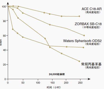 使用设计用于加速柱降解下的条件,ACE C18-AR相显示保留损失极少,其寿命相当于高度稳定的ACE C18相。两种固定相均由相同的超纯硅胶而制成,而且比Zorbax SB-C18的耐久性更好(Zorbax SB-C18曾视作在高温和低pH条件下具有极好稳定性的固定相)。