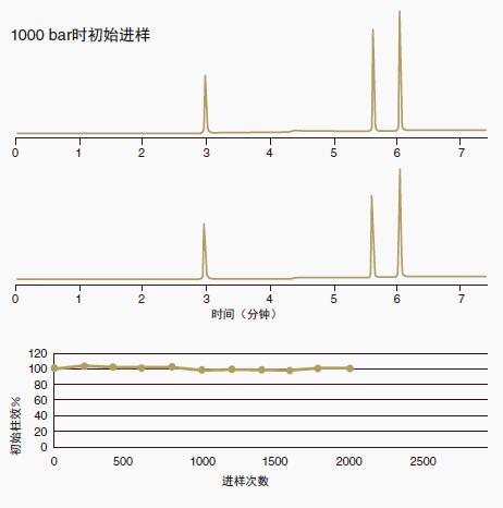 将2.1×100mm ACE Excel C18 UHPLC色谱柱在平均1,000 bar(14,500 psi)压力下进行2000多个梯度的运行。