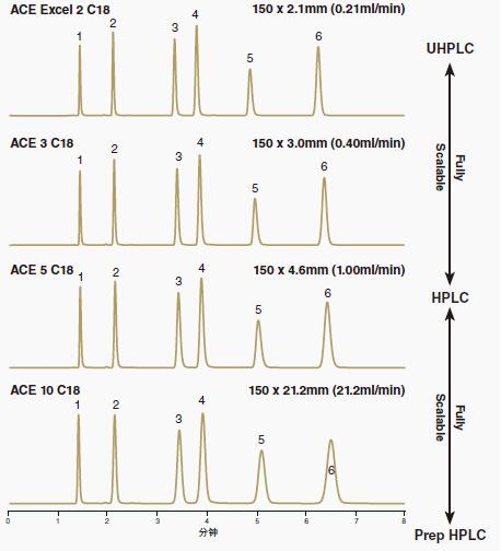 当使用ACE Excel UHPLC色谱柱进行快速方法开发,且该方法必须可转移到HPLC时,易扩展性则显得特别有价值。