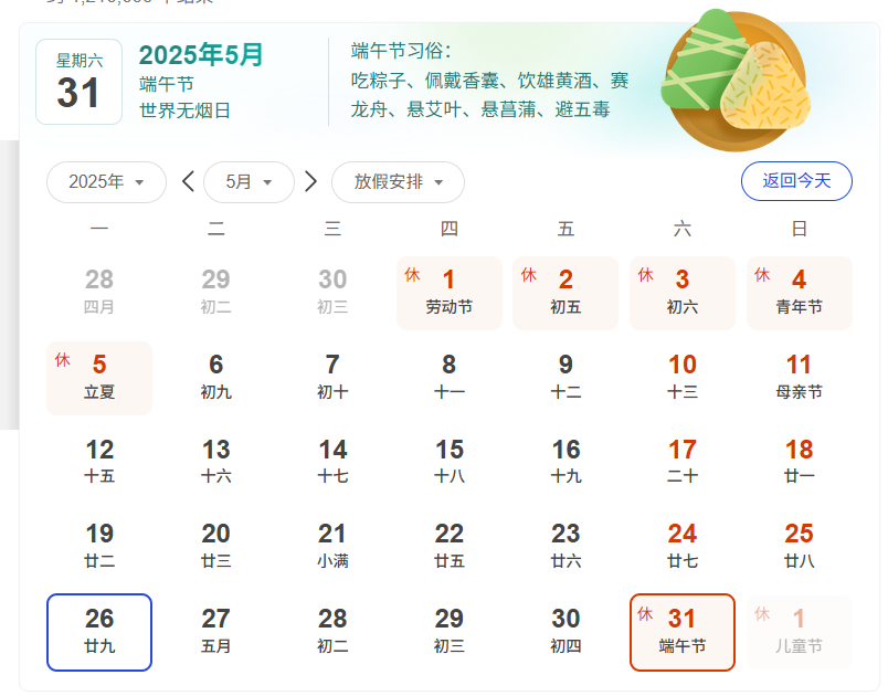 我司端午节放假时间为2025年5月31日至6月2日放假,共3天。