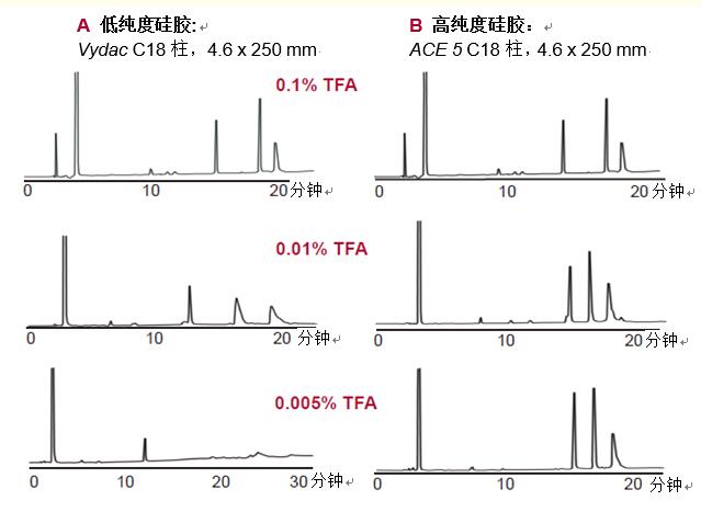 硅胶纯度。高效液相色谱柱所用硅胶填料的纯度对分离性能至关重要。金属离子杂质会导致峰拖尾和分辨率下降,如图7A所示(0.01%和0.005%的TFA)。