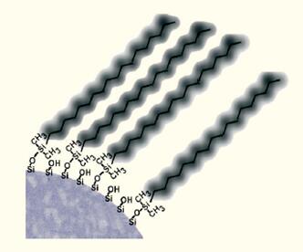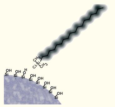 含烃链的氯硅烷,如十八烷基氯硅烷,与硅胶(表面有极性硅烷醇基)反应使碳氢化合物附着在硅胶表面(图9)。