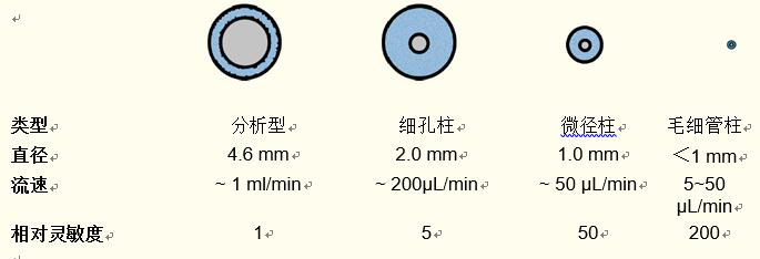 微径柱的流速为~50微升/分钟,因此采用微径柱的灵敏度更高,约为分析柱的50倍。