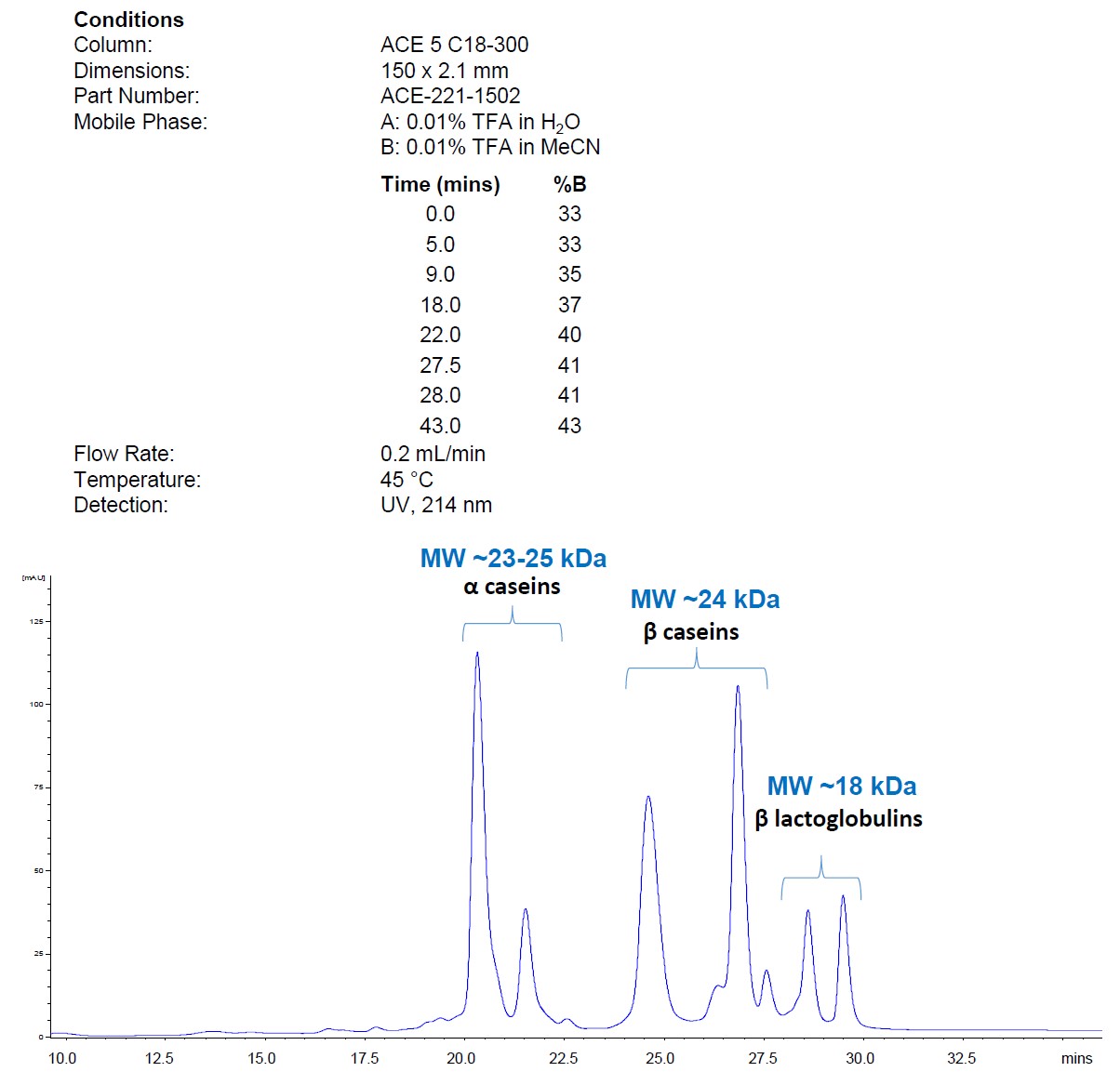 反相HPLC灵敏、通用性强,能够分离结构近乎相同的蛋白质。ACE反相色谱柱采用含极低金属离子杂质的超惰性硅胶制成,使用极低浓度离子对试剂依然可以维持良好的峰形。
