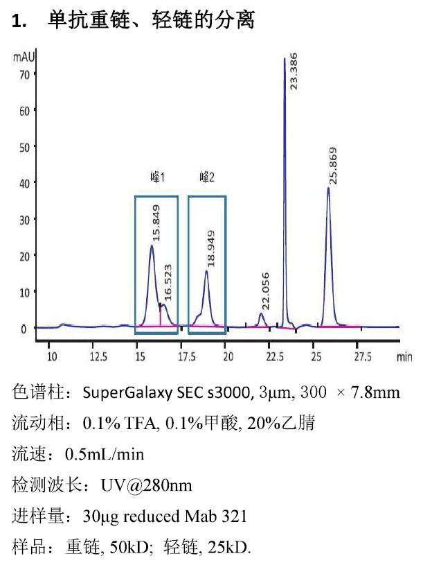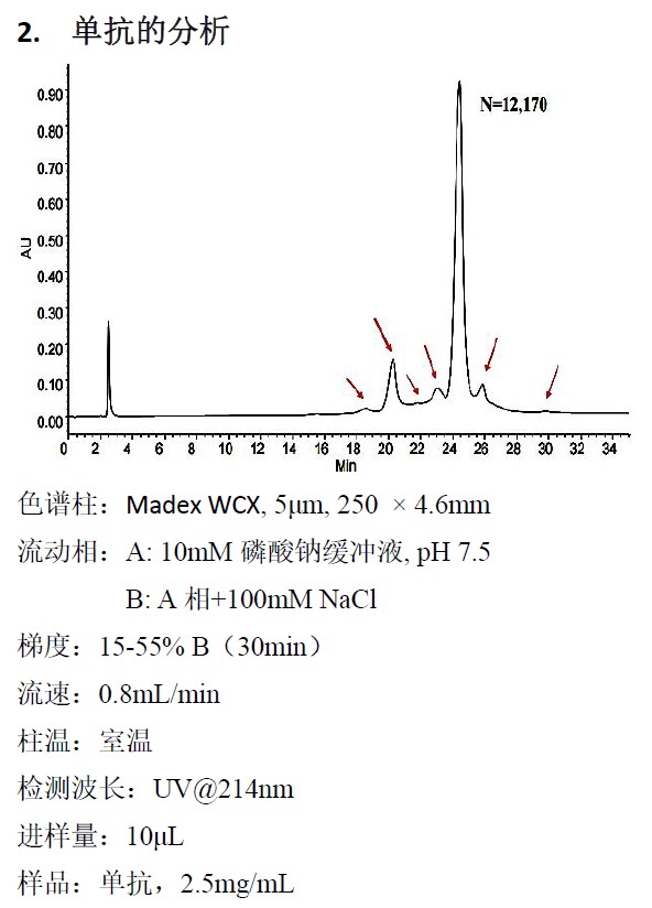离子交换色谱,是根据蛋白质分子在一定PH值和离子强度条件下所带电荷的差异进行分离的方法。Madex 系列离子交换色谱柱以聚苯乙烯/二乙烯苯(PS/DVB)颗粒为填料,并在其表面键合有一层高度亲水的纳米厚度的中性聚合物薄膜,最后再将离子交换官能团致密、均匀地键合在亲水表面而制成。四种固定相互补,其中,WCX 固定相是专为抗体分离而设计。