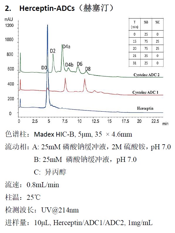 疏水作用色谱,在保持蛋白活性前提下,是根据分子表面疏水性差异分离蛋白质的方法。Madex HIC-B 疏水作用色谱柱是以聚苯乙烯/二乙烯基苯(PS/DVB)为基质,通过独有的化学键合技术将丁基均匀、致密地键合在基质表面而制成。这种无孔单分散的疏水填料特别适合于分离单克隆抗体、抗体偶联物(ADC)及具有疏水性差异的蛋白片段等。